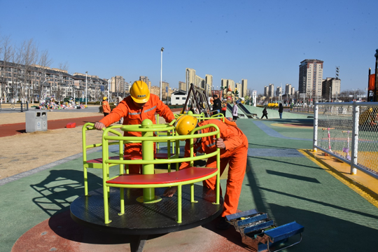 在公園廣場里,秩序井然,工作人員一絲不茍地對游樂健身設(shè)施進(jìn)行全方位檢查,“不遺漏”任何一顆螺絲、一根繩子,確保設(shè)施安全運(yùn)行,讓市民游客過一個“放心年”。