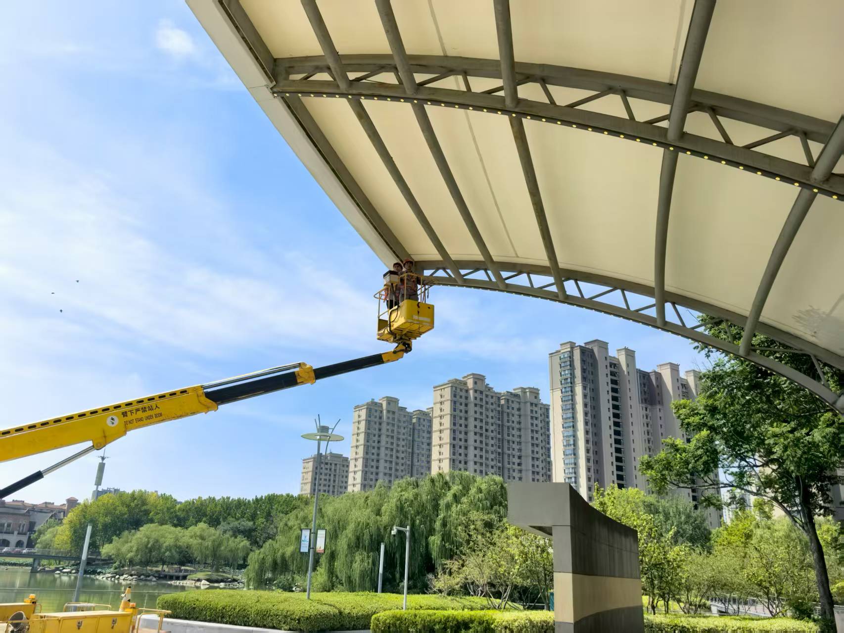 “今天在蘇州公園大舞臺(tái)進(jìn)行登高作業(yè),維修頂部燈光。注意作業(yè)平臺(tái)與頂棚保持安全距離……”8月20日上午9點(diǎn),夏日驕陽(yáng)似火,蘇州公園作業(yè)現(xiàn)場(chǎng)氣溫已接近37℃。園區(qū)機(jī)電維護(hù)項(xiàng)目部技術(shù)負(fù)責(zé)人沈剛強(qiáng)和同事們開(kāi)始了當(dāng)天的第一場(chǎng)高空維修。